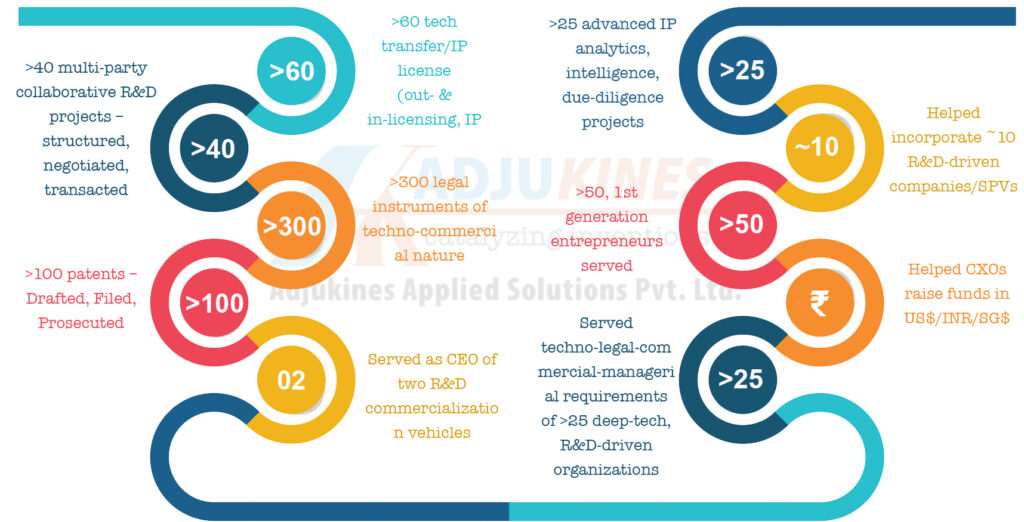 Team Adjukines form a pivotal part of team Vipragen. In our plans to expand from a state-of-the-art pre-clinical contract research company to an asset development organization, Adjukines play a multidimensional role. Adjukines helps us in-license IP assets from multiple sources (from India and abroad), make and pursue development plans, and manage and nurture our overall IP asset portfolio. En route, we get immensely benefitted from their deep expertise to conduct IP, scientific, and legal due diligence, pursue techno-commercial and techno-legal negotiations, and bring multi-party discussions to conclusion through necessary legal papers. We are happy that in the last ~2 years, Adjukines’s role in our strategies and operations has witnessed multifold increase.